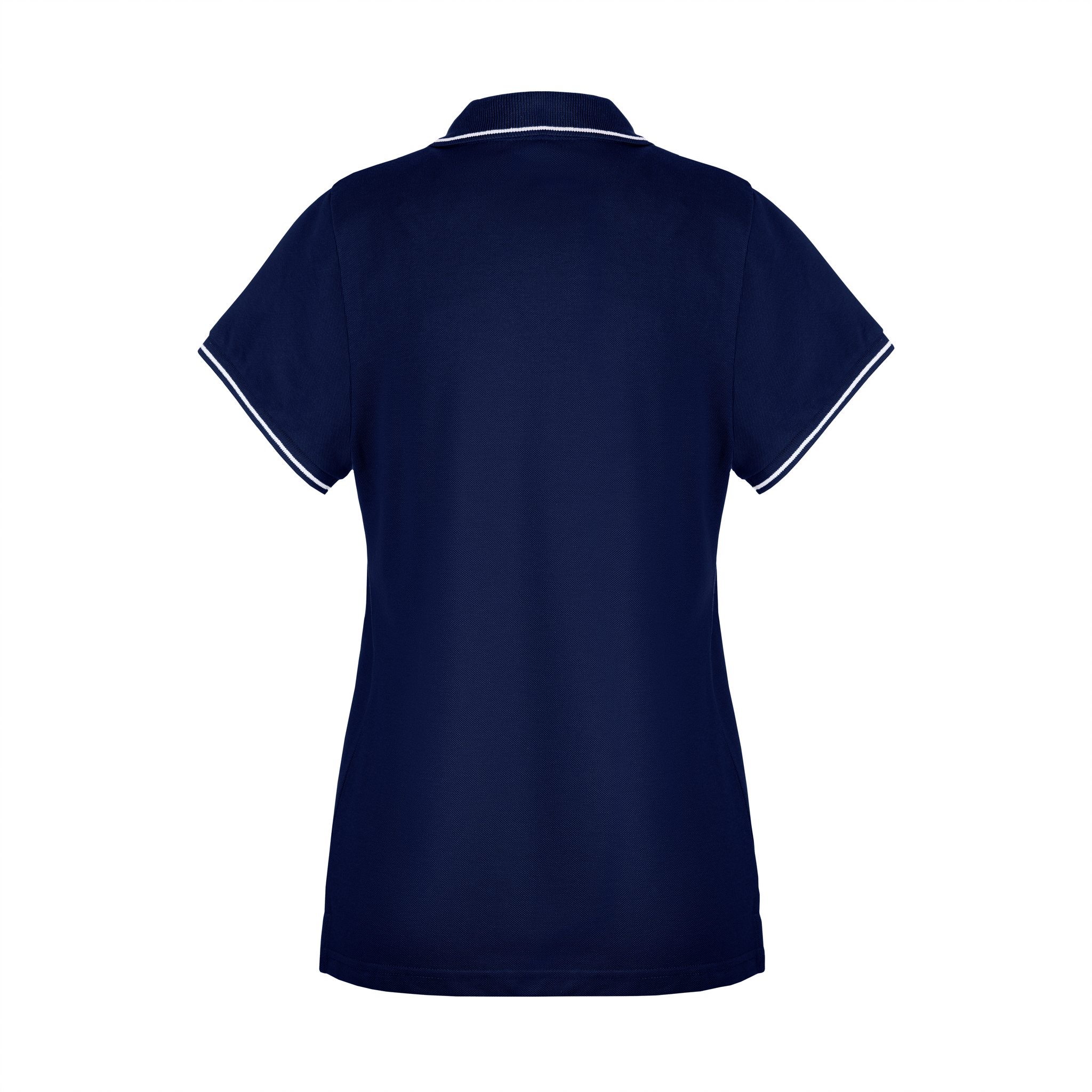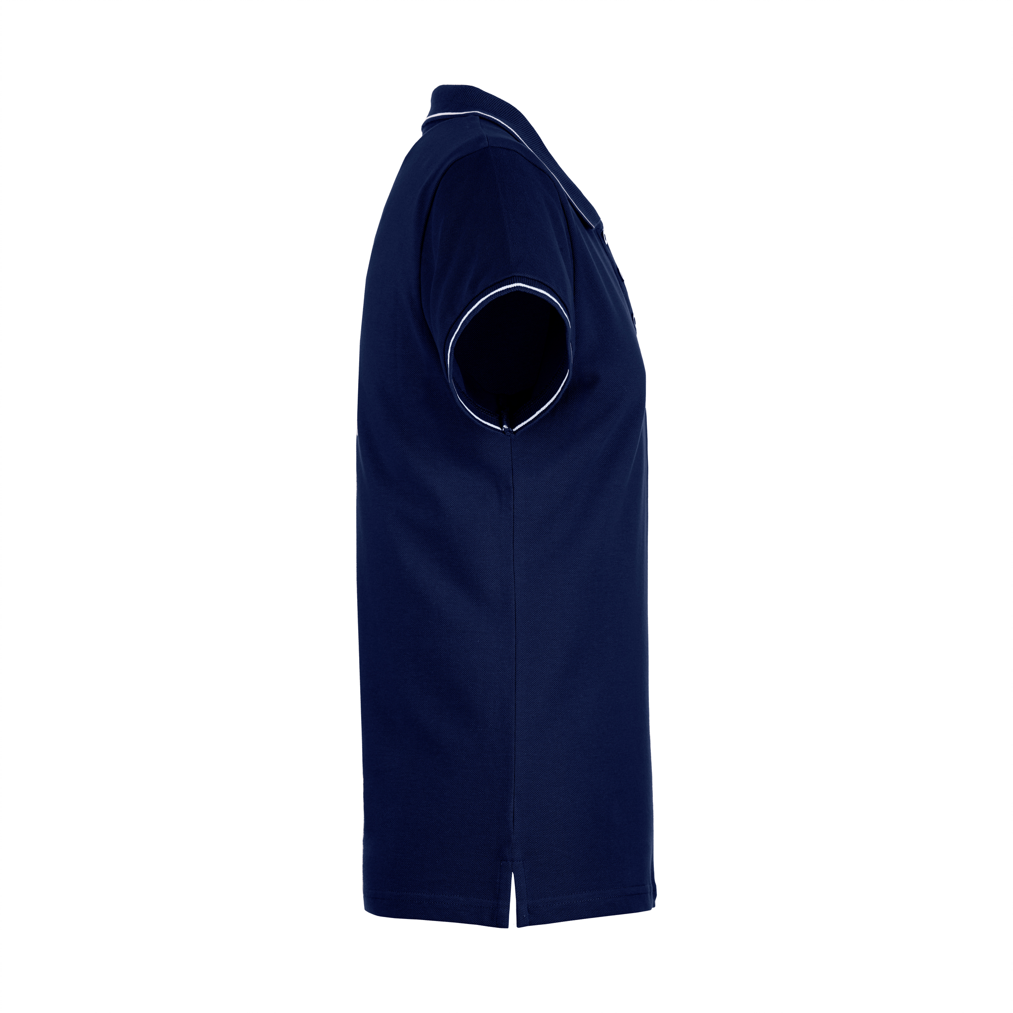 Collar and sleeves cuffs in rib 1×1 • Contrasting bicolour colour detail on the collar, reinforcing tape, placket and sleeves cuff • Short sleeves •Reinforced placet with 2 tone on tone buttons and a spare button on inside stitching • Bottom side slits in contrasting colour • Fitted cut